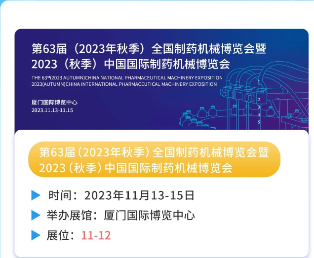 2023年11月13-15日,厦门国际博览中心的第63届全国只要机械博览会暨2023(秋季中国际制药机械博览会,展位11-12
