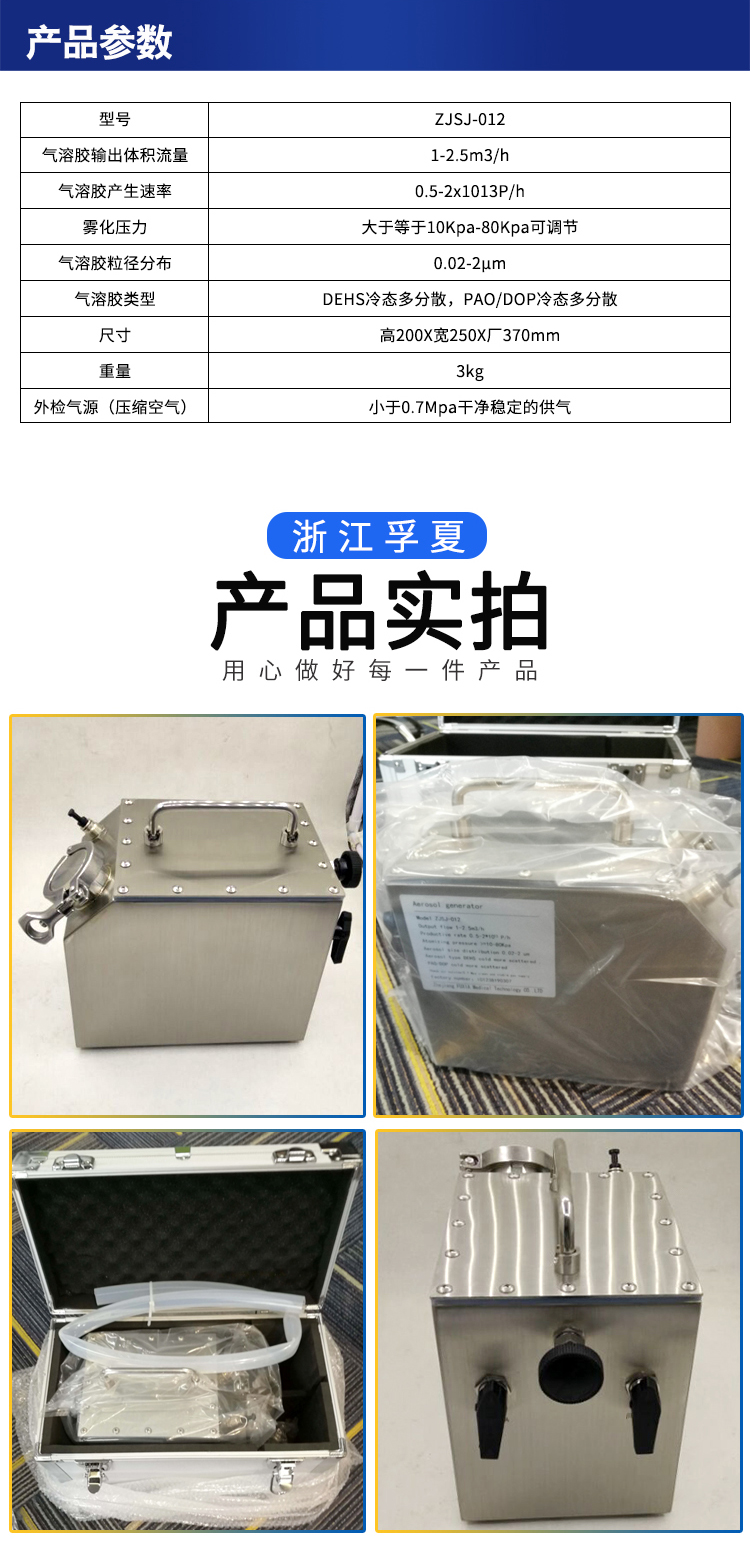 ZJSJ-012型气溶胶发生器是我公司自行研制并生产的便携式冷发生气溶胶发生器,这种气溶胶发生器适用于空气流量在≤50000m3/h,可发生出0.5-2×1013 P/h的多分散性气溶胶。它可以满足所有小型洁净单元到大型洁净室送风系统的HEPA 过滤器测试的要求。ZJSJ-012产生出一种连续,稳定的气溶胶粒子,并加注溶液方便。