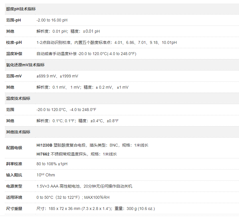 主机,HI1230B 塑胶复合酸度电极,HI7662 不锈钢温度探头,酸度标准缓冲液套装(标准值@25°C:4.01pH、7.01 pH 和常规电极清洗液,规格:20mL,袋装),HI740036P 塑料刻度烧杯(100mL、1个),中英文使用说明书,HI721046 定制专用携带箱。