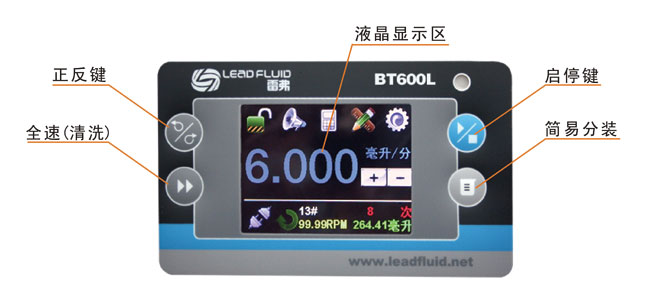 BT600L流量型智能蠕动泵流量范围0.006~2900毫升/分钟。采用彩色液晶和触摸屏技术,操作界面简单,直观,明了。主要适用于精准流量传输控制,用户可以根据自己的需要流量显示,流量控制,流量累计。同时本产品实现了重复定时定量传输。适用于精确计量和定量给料,精度最高可达0.5%,为了减小不必要的蠕动泵噪音,采用了智能温控技术。在RS485通讯中,因为采用了MODBUS协议,更易于与其他控制设备如计算机,人机界面,PLC等连接。