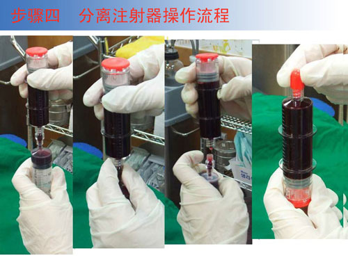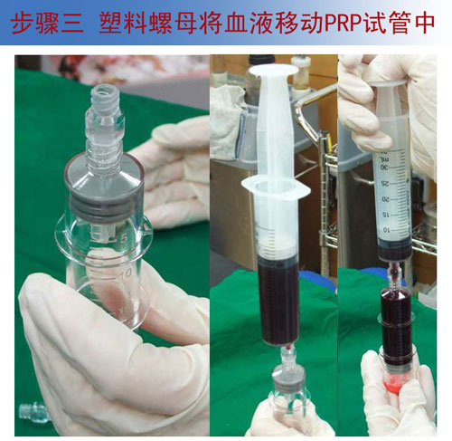 具体操作方法:翻转注射器和PRP试管,用一只手固定塑料螺母另一只手抓住PRP试管,将位于上部的PRP试管逆时针旋转分离PRP试管与注射器,翻转PRP试管前端朝上并用塑料堵头堵住。