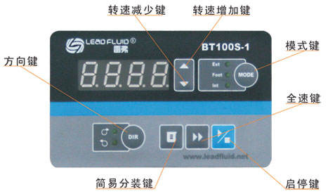 BT100S-1调速型蠕动泵流量范围0.00016~1500毫升/分钟;工作转速0.1-150转/分钟;具有正反,启停,全速(清洗),调速等基本功能外,另外还可通过“简易分装键”实现定时定量输送液体的功能。在RS485通讯中,因为采用了MODBUS协议,更易于与其他控制设备如计算机,人机界面,PLC等连接。