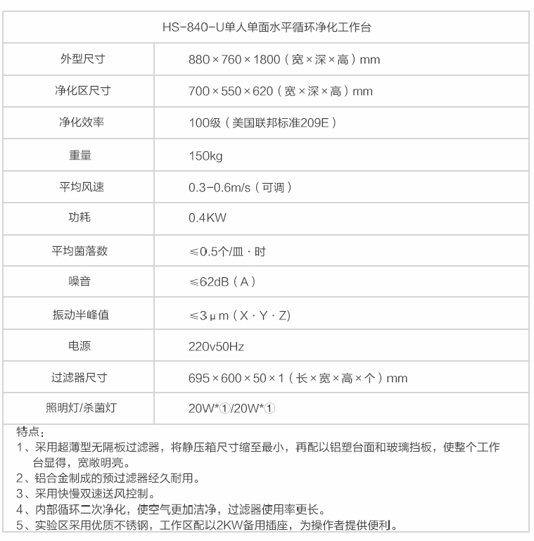> 苏州智净单人单面(水平)循环风洁净工作台 HS-840-U