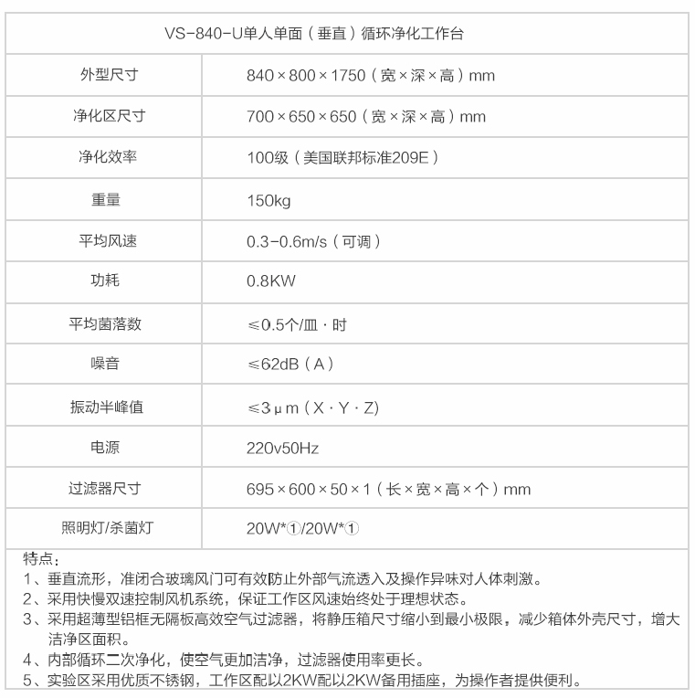 > 苏州智净单人单面(垂直)循环风洁净工作台 VS-840-U