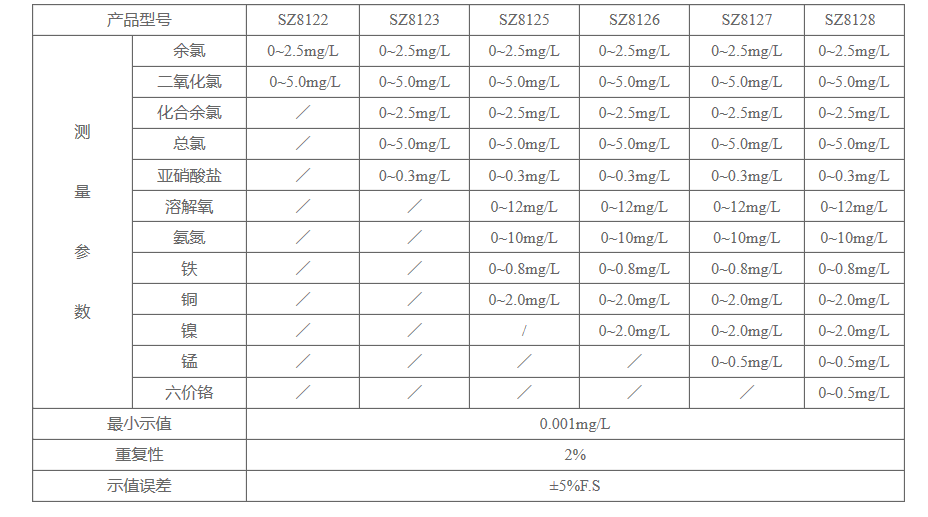 可同时测量 5 种参数:余氯、总氯、化合余氯、 亚硝酸盐、二氧化氯、溶解氧、氨氮、铁、镍、铜等离子浓度